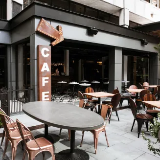 Cafe at Bobby is a vibrant space with an airy, pet-friendly patio and cozy indoor seating. Focused on neighborhood ingredients, offerings include coffee, beer, and wine all accompanied by brunch bites.