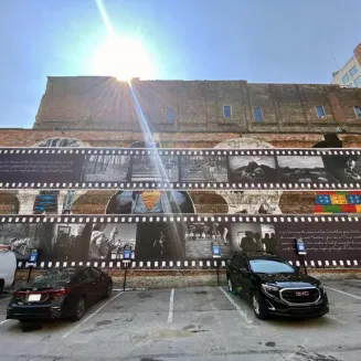 Starting at far left, the striped deer with butterflies is by Herb Williams, who is known for his multicolored animals, large and small. Next is a work by Chris Zidek, who signs his work Zidekahedron. Sam Dunson is responsible for the laughing hashtag man, while Emily Miller‘s work is next. Finally, the young boys fishing on Leggo blocks are the work of Brian Donahue, a professor at Tennessee State University.