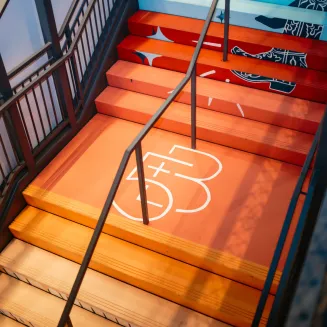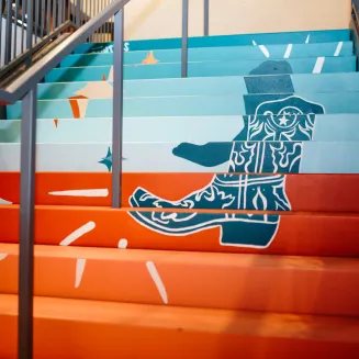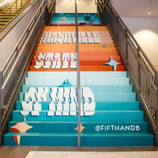 The new Nashville State of Mind mural can be found in the Fifth + Broadway stairwell. Featuring a mix of warm oranges, cool blue tones, and a classic pair of cowboy boots, the pop of color is the perfect spot for your next multilevel photo opp. Julia Soria is a nationwide muralist and the owner of Pretty Good Painters, who travels the country to bring her bright, colorful masterpieces to new communities.