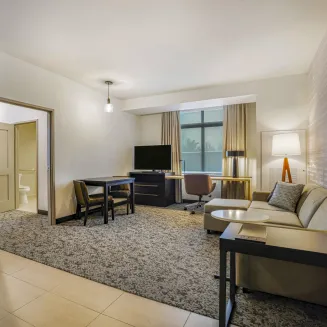 Each spacious suite features a full kitchen, separate living and sleeping areas, and free WiFi—perfect for extended stays or weekend getaways. Start your day with our complimentary hot breakfast and unwind in the evening at our outdoor pool or fitness center. Stop by our lobby bar for a refreshing beverage or grab a bite to eat. Enjoy the complimentary shuttle that is available within a 4 mile radius. Traveling with your pet? We’re pet-friendly, too!