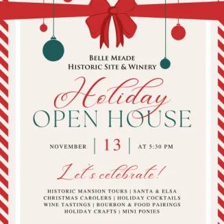 Step into the holiday season at Belle Meade Historic Site & Winery's Holiday Open House, a magical evening filled with festive cheer for the whole family. Wander the beautifully decorated grounds, enjoy twinkling Christmas lights, and experience the spirit of the season with:
