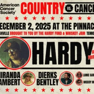 The American Cancer Society's Country vs. Cancer is a benefit concert brought to you by the HARDY Fund and Whiskey Jam featuring HARDY, Miranda Lambert, Dierks Bentley, Lanie Gardner, and McCoy Moore. Cancer impacts 1 in 3 people, and every 15 seconds, someone in the United States is diagnosed with the disease. This Giving Tuesday, be a part of something bigger. All net proceeds from Country vs. Cancer will further ACS's mission to improve the lives of people with cancer and their families through groundbreaking research, expanded treatment access, and trusted support services, no matter who they are or where they live.
