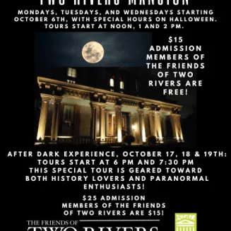 1) Daytime tours of the historic Two Rivers Mansion property and hear a ghost story or two! $15/adult $10/child (Friends Members are free!).