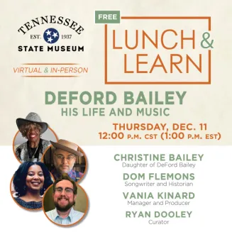This Lunch and Learn event is in-person in the Museum's Digital Learning Center at 12:00. No RSVPs are required to attend this free event. It will also be livestreamed on the Museum's website at TNMuseum.org/Videos. If you have any questions, please email [email protected].Boxed lunches made by Apple Spice Nashville are available for purchase for $12.24 to enjoy during the event. The lunches will include a sandwich, chips, and a cookie. Lunch orders must be placed by noon on Tuesday December 9, 2025. Please order your boxed lunch on the ticket registration page.