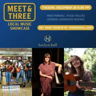 Join us at Harken Hall on Tuesday, November 11 for the latest installment of Meet & Three Local Music Showcase — where at least three local artists take the stage each night for an evening of music and community.