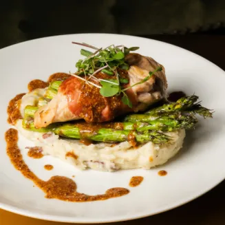 - Prosciutto wrapped bone-in chicken breast served with mashed red potatoes, roasted asparagus, whole-grain mustard demi glaze and dinner rolls.