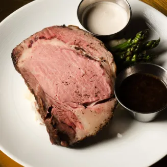 - Carved prime rib served medium with a side of house-made horseradish cream, Au Jus, lemon pepper asparagus, mashed red potatoes and dinner rolls.