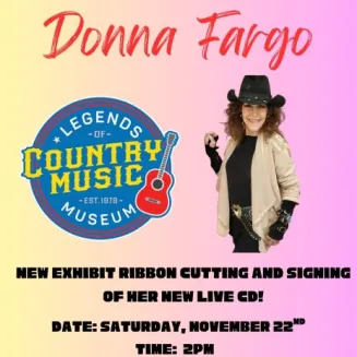 Come join the "Happiest Girl in the Whole USA," Donna Fargo for her brand new exhibit opening and ribbon cutting. Admission to the museum is FREE for this event and Donna will be doing a meet and greet and signing of her new live CD. There will be a raffle with all sorts of fun prizes!