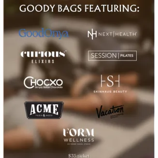 Included with your $35 ticket, you will receive a goody bag with items from Next Health, Acme, Vacation Sunscreen, Chocxo, Goodonya, Curious Elixirs, SKINHAUS, FORM Wellness & SESSION Pilates.