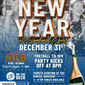 It's the biggest party of the year, and we're doing it Scoreboard-style! Join us as we count down to midnight with live music, football, dancing, champagne, and the best New Year's Eve energy in Music Valley.