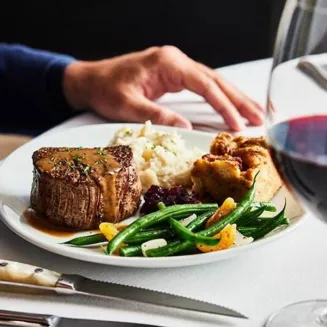 Savor a 2-Course Menu featuring your choice of our ever-popular Filet Mignon, impressive USDA Prime Bone-In Ribeye, or classic Mixed Herb-Roasted Turkey — complete with a starter and all the traditional fixings.