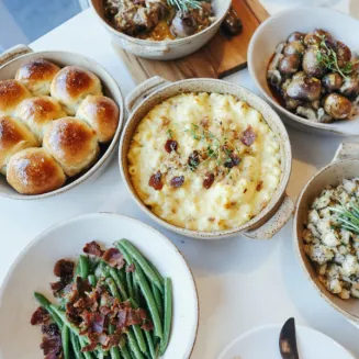 Begin your meal with your choice of Butternut Squash Bisque or Autumn Fig & Goat Cheese Salad, then enjoy a main entrée of Smoked Heritage Turkey, Cider-Brined Ham, or upgrade to an 8oz Prime Rib — each paired with a curated selection of family-style sides designed for sharing. Highlights include Sweet Potato & Honey Rolls, Truffle Mushrooms with Haricots Verts, Garlic Herbed Potatoes au Gratin, and Cornbread-Topped Mac & Cheese.